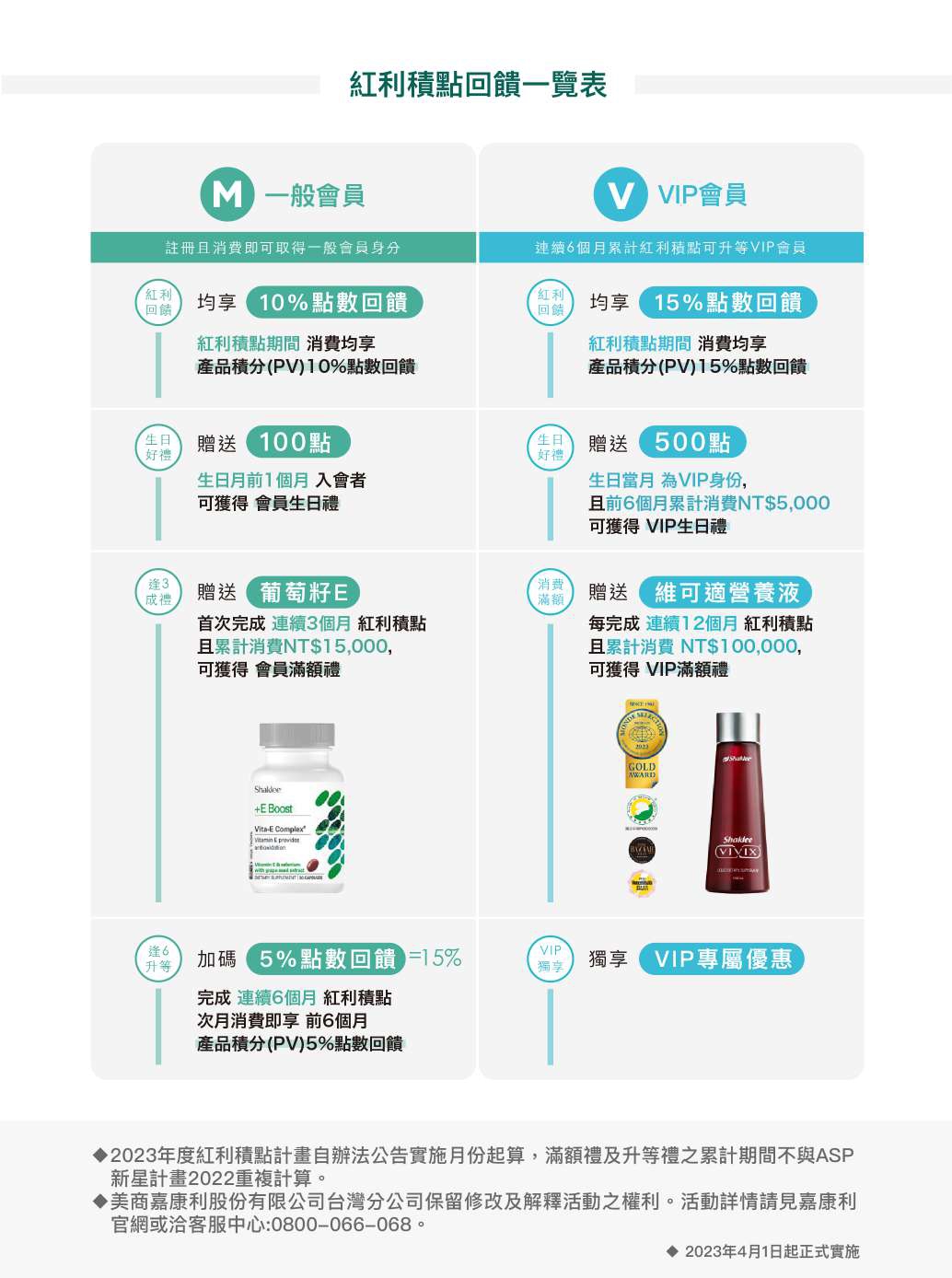 一般會員連續6個月於紅利積點期間消費積分(PV)產品,將於第7個月起升等為VIP會員。升等當月完成紅利積點訂單後,可獲得第1至第6個月消費總積分(PV)5%紅利點數回饋 (升等當月15日歸戶)。
