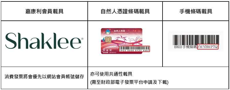 電子發票載具是記錄電子發票資料工具,需至財政部電子發票平台申請及下載。消費者於商品訂購時選擇開立電子發票,系統將會優先以網站會員帳號做為儲存電子發票載具,消費者亦可另選擇共通性載具儲存,嘉康利可使用發票載具請見下方圖示: