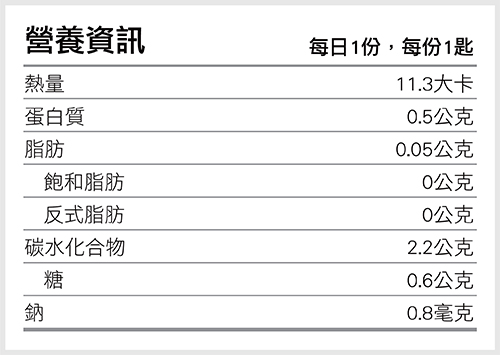 營養成份每一份量5毫升 (1茶匙)/本包裝含30份容量:150 毫升 【為了配合衛福部針對食品的法令變更,公司產品之營養標示欄位可能因法令修改而略有出入,實際標示請以產品包裝上為主,如還有任何疑問,請撥打公司客服專線諮詢。】 食品業者登錄字號:A-122660429-00000-9