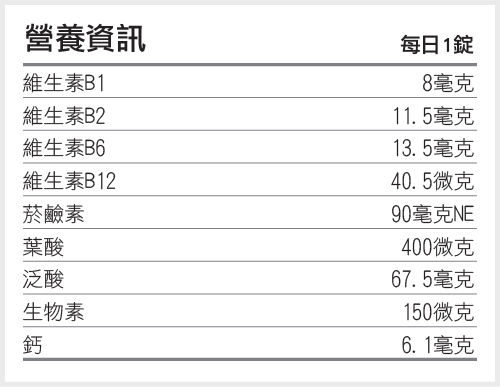 維特B複合錠提供8種人體必需維生素B群,結合專利葉酸覆膜科技,滿足身體一天所需,能促進新陳代謝、增強體力、維持健康,一天一錠讓您神采奕奕,精神百倍!